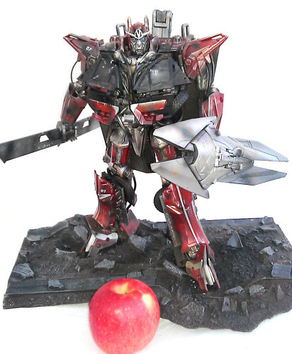 Darkcave Customs has recreated the way and the look of Transformers Revenge of the Fallen and Dark of the Moon Sideswipe, he has recreated the character into Animated form. The toy is a custom Sideswipe with custom head and classic signiture Swards on the sides of his arm. With this new style and look Sideswipe has never been faster then he is now.