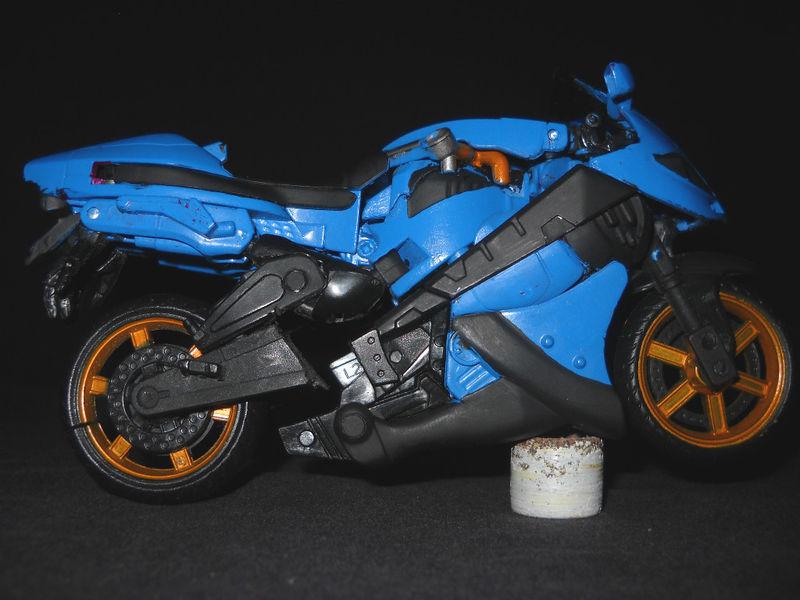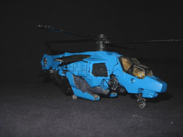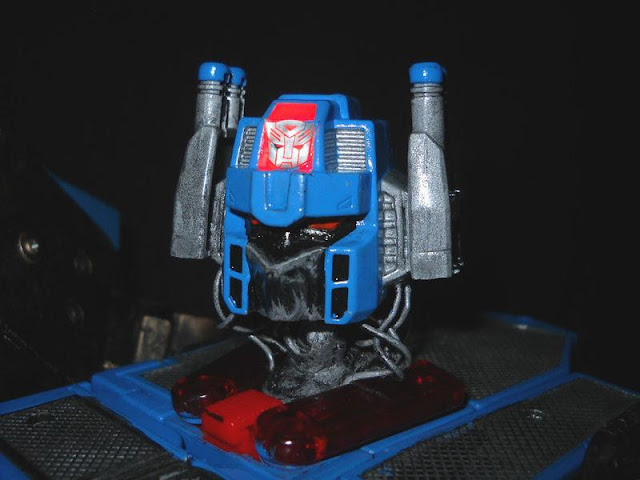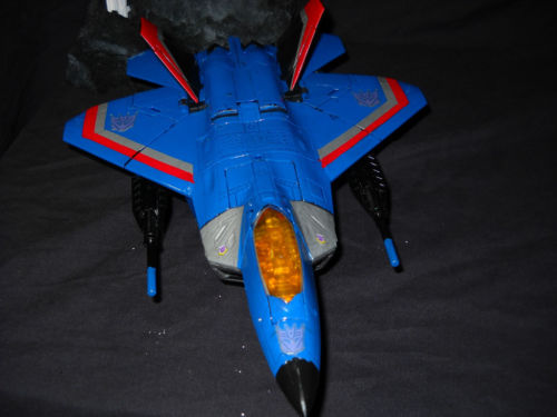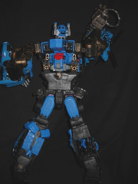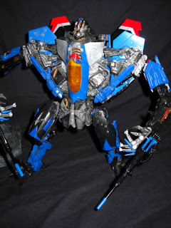 BCGCustoms said he based this on the old classic Generation 1 version but wanted to reflect his insanity, so he made it in the form of an F-22 Raptor Jet Mode instead of the old F-18 used in the 1984 TV Show and Comics. He painted it in the old classic blue with patterens like the old version with the red and white stripes, unfortnantly, no Deluxe, Voyager, or Leader has the available Null Rays, so he built them in scratch. During the painting prossess, BCG wanted to create battle damage and fresh wonds, so he cleaverly watch the Transformers movies agian and again to create molten metal drawn down his face like the Forrest Battle scenes. The hands come from fakebuster83's custom hands made for Starscream in the Transformers Hunt For The Decepticons Leader Class line