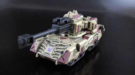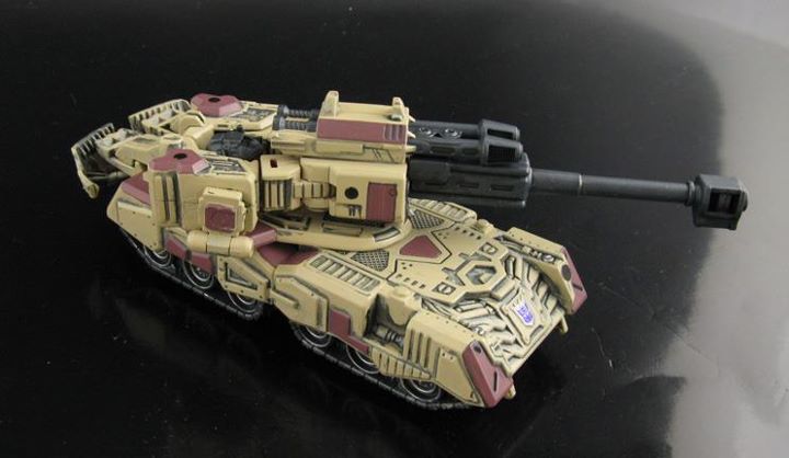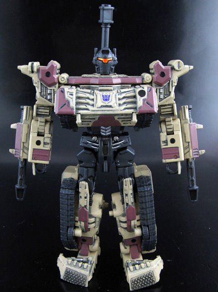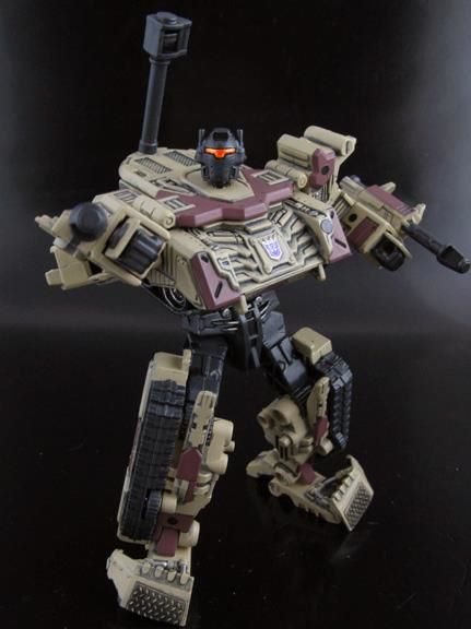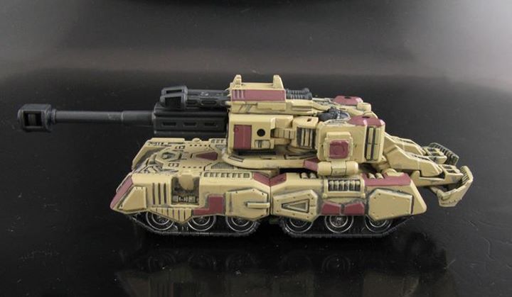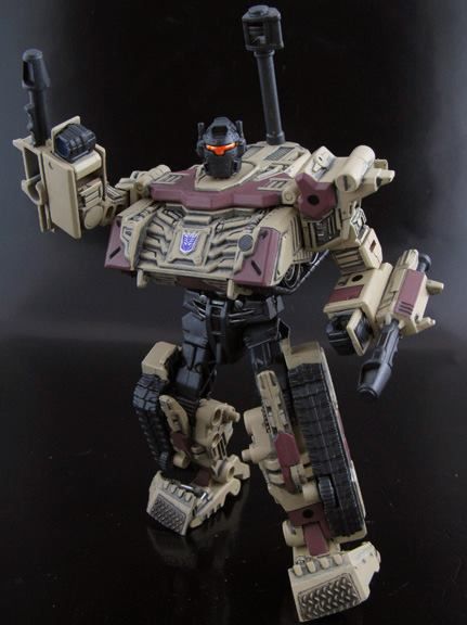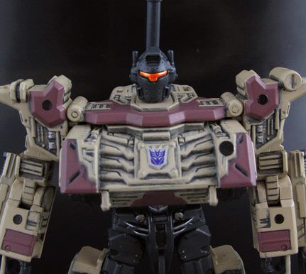 "If it's one thing I love in Transformers it's Tankbots! Warpath, Bludgeon, Brawl, etc. Here's Armorhide of the Decepticon Commandos that form Ruination (or Desert Attack Bruticus if you're so inclined) done as a standalone character. He was made from the body Classics Deluxe Megatron that came in the 2-pack, arms from the Prime in the same pack, PCC Steelshot's head, a Megabloks Iron Man Drone gun, and Universe Jetfire's gun. Prime's arms snap right on to Megatron's biceps with only a little bit of plastic shaving needed. One desert tan and light brick red paint job later, Armorhide was ready to blast away the Autobots!"
